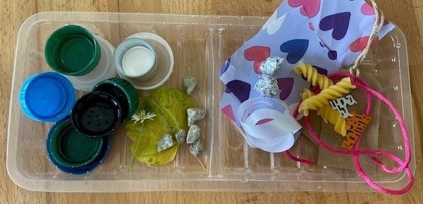 Begin collecting suitable small items before they go in the recycling. For example, magazines and leaflets, wrapping paper, birthday cards, bottle tops, ribbons/string and colourful wrappers. (Small items can be a choking hazard to young children, so make sure you supervise them.)